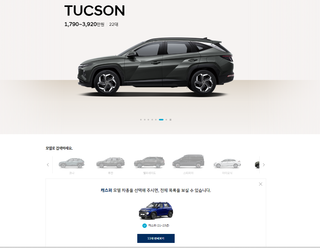 아반떼, 쏘나타, 그랜저, 베뉴, 싼타페 등 현대자동차의 모델을 좌우로 움직이며 선택할 수 있습니다. 글작성 시점(2023년 12월 18일)을 기준으로 캐스퍼는 11대 등록되어 있는 것을 확인할 수 있습니다. 캐스퍼를 클릭하고 모델 선택에서 캐스퍼 디 엣센셜을 선택하면 4대의 차량이 검색됩니다.