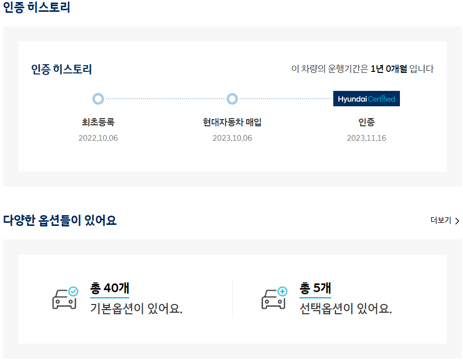 인증 히스토리에서는 신차출고일과 현대자동차의 매입일, 성능점검일, 인증일이 표출됩니다. 아래의 옵션확인 부분에서 더보기를 클릭하면 옵션의 상세내용을 확인할 수 있습니다.