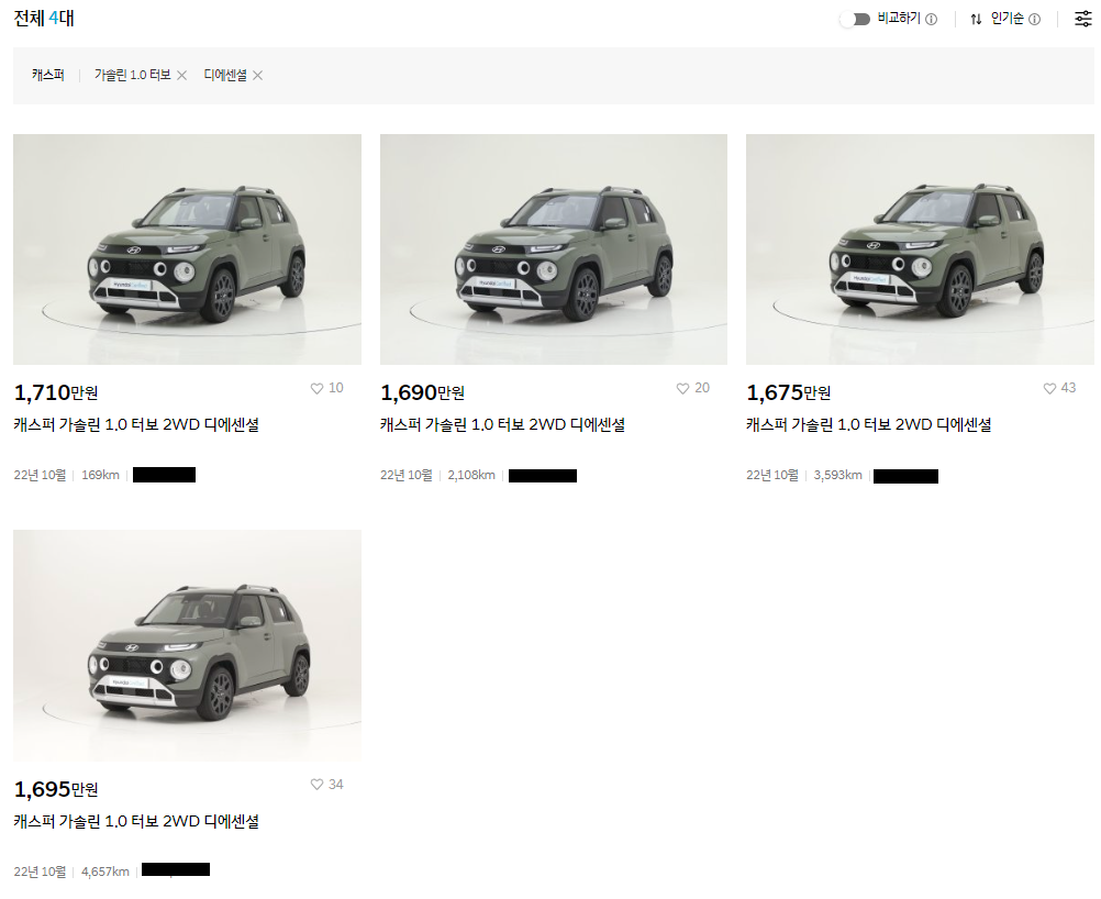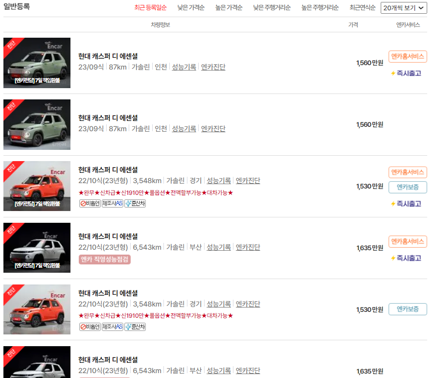 캐스퍼 디에센셜이 현대인증중고차에서는 4대가 등록되어 있고 엔카에서는 29대가 등록되어 있습니다. 현대인증중고차 4대의 평균가격은 1,692만원, 엔카에서는 최근 등록일순으로 10대의 평균가격은 1,571만원으로 현대인증중고차가 120만원 정도 높습니다.