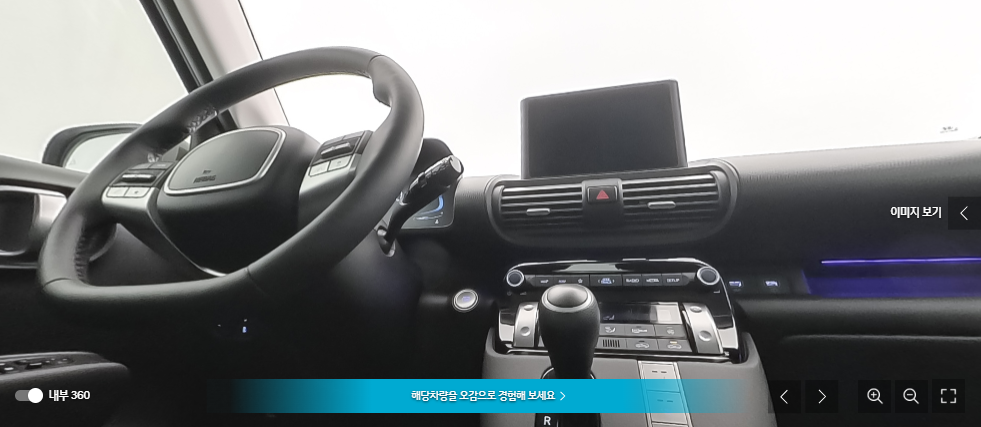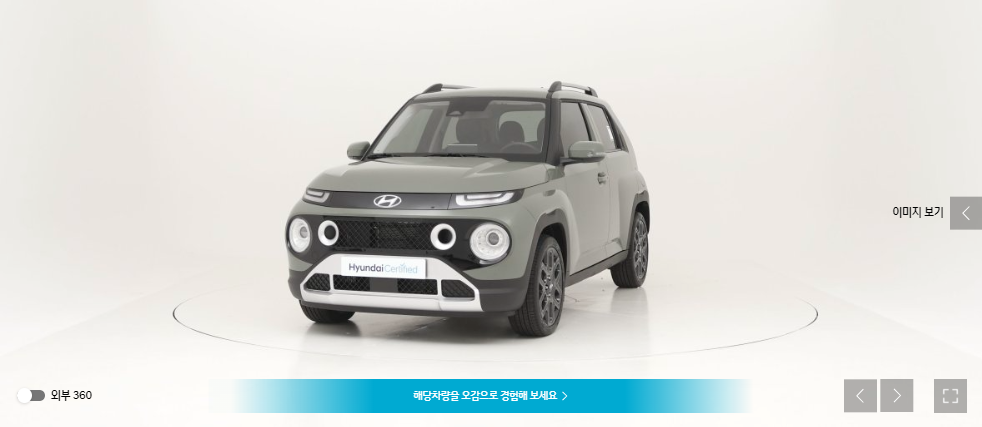 내/외부를 360도로 돌려가면서 돌려가면서 확인할 수 있는 화면입니다. 마우스를 이용하여 내/외부를 자세히 돌려볼 수 있습니다. 모든 이미지의 퀄리티가 높으며 거의 같은 구도로 모든 차량을 찍기 때문에 비교가 용이합니다. 이미지의 퀄리티는 타 중고거래 사이트와 비교불가 수준입니다.