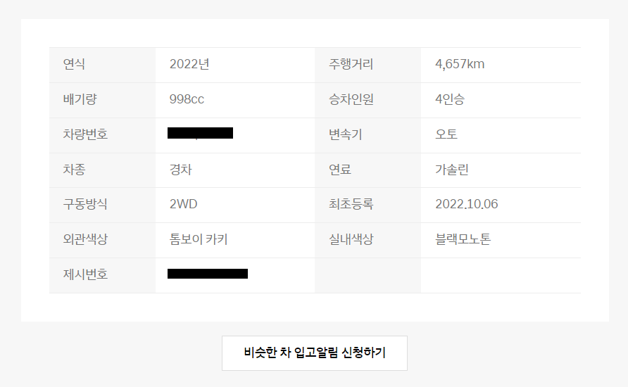 차량의 기본정보입니다. 비슷한 차가 입고될 경우 알림이 오도록 신청할 수 있습니다. 물론 로그인이 필요한 서비스입니다.