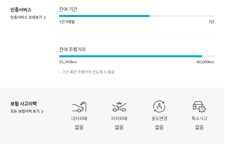 보험 사고이력도 확인 가능합니다. 인증서비스의 잔여기간과 잔여 주행거리도 자세히 표시됩니다.