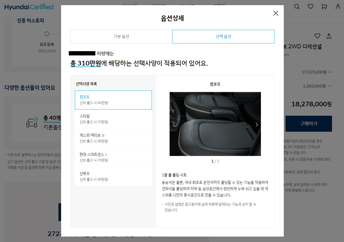 기본옵션과 선택옵션에 대해 상세하게 확인할 수 있습니다. 선택사양 목록에서는 신차 출고 시 해당 옵션의 가격까지 나타납니다.