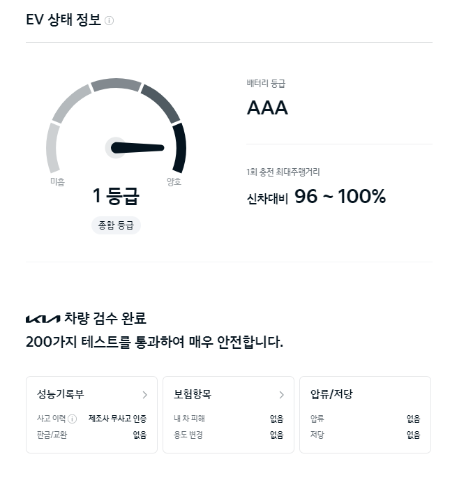 배터리등급도 볼 수 있고 신차대비 최대주행거리도 볼 수 있습니다. 이 차량의 경우 96~100%까지 나옵니다. 성능기록부와 보험항목, 압류/저당 정보가 나타납니다.