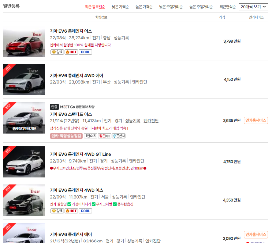기아자동차가 직접 운영하는 중고차 거래 서비스인 기아인증중고차에 대한 관심이 높아지고 있는 가운데 대기업에서 판매하는 중고차의 가격과 서비스에 대한 궁금증도 높아지고 있습니다. EV6는 2023년 11월 기준으로 월 1,155대의 판매량을 보이고 있습니다. 이는 국내 승용 자동차 판매량에서 38위, 그리고 국산 준중형 SUV 중에서 6위에 해당합니다. 여기에서는 EV6를 기아인증중고차에서 제공하고 있는 정보와 함께 기존의 대표적인 중고차 거래 서비스인 엔카와 기본적인 가격비교를 해보았습니다.