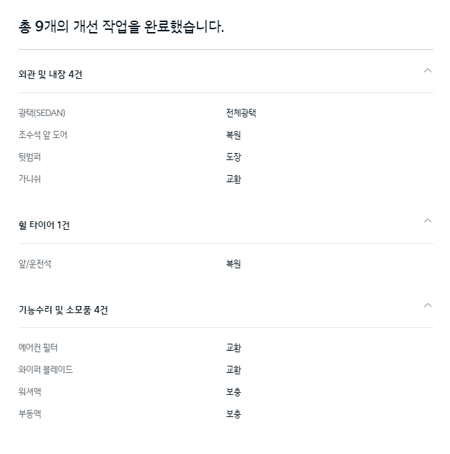 기아인증중고차에서 차량을 구입 후 개선 작업을 한 내용입니다. 다른 중고차 거래사이트에서 보여주기 힘든 정보로 어떤 부분에 대한 작업이 이루어졌는지 리스트로 제공하고 있습니다.