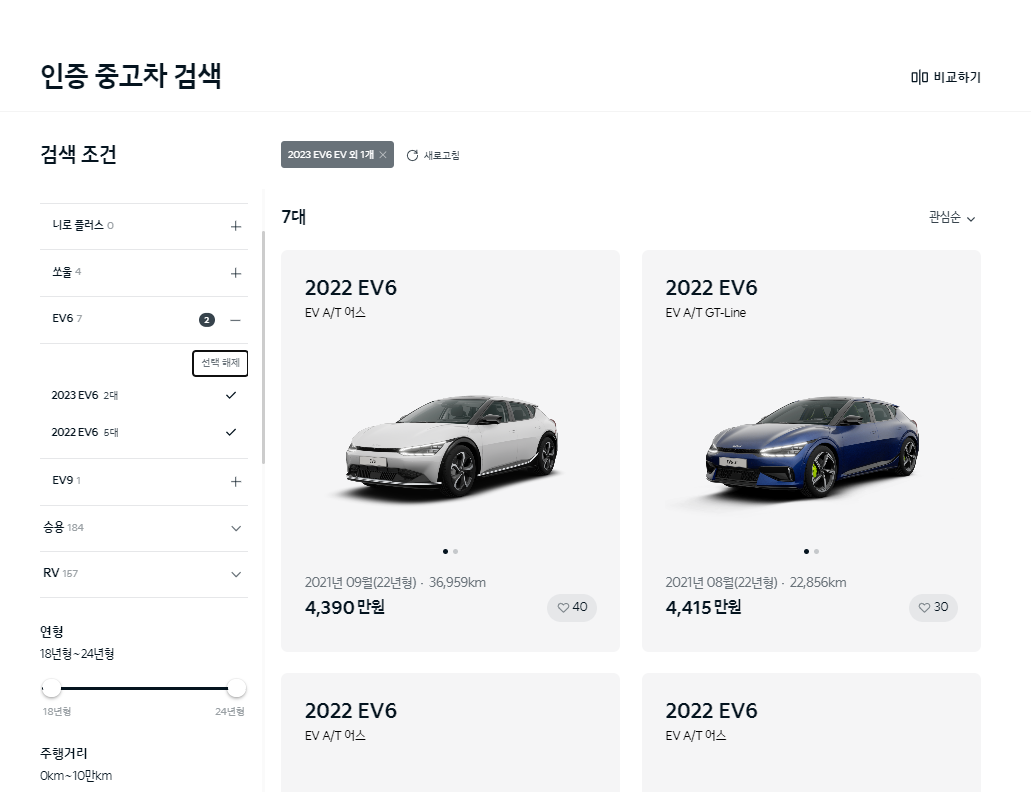 기아인증중고차의 홈페이지를 검색하여 들어가면 상단에 내차사기를 클릭하고 좌측의 차량리스트에서 EV > EV6 를 선택한 화면입니다. EV6는 현시점(23.12.24)에 7대가 검색되고 있습니다. 주행거리가 가장 짧은 차량이 6,537km이고 가장 긴 차량은 36,959km입니다.