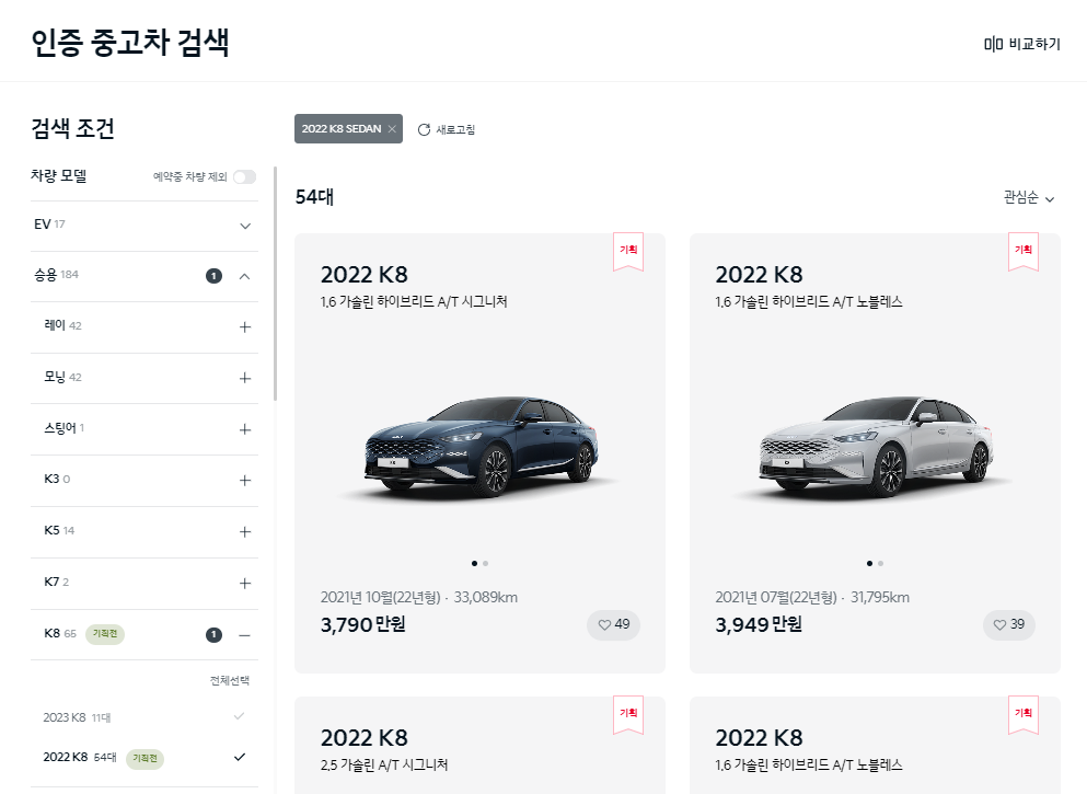 기아인증중고차의 홈페이지를 검색하여 들어가면 상단에 내차사기를 클릭하고 좌측의 차량리스트에서 승용 > K8 > 2022 K8 를 선택한 화면입니다. K8는 현시점(23.12.24)에 65대가 검색되고 있고 그중 2022 K8은 54대가 검색됩니다. 다시 하이브리드를 선택하면 41대로 줄어듭니다. 주행거리가 가장 짧은 차량이 7,952km이고 가장 긴 차량은 60,871km입니다.