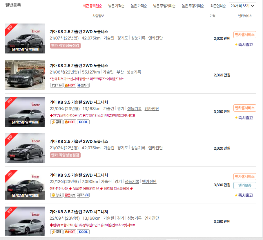 | 기아인증중고차 K7 중고차 VS 엔카 가격비교 (0) | 2023.12.24 |