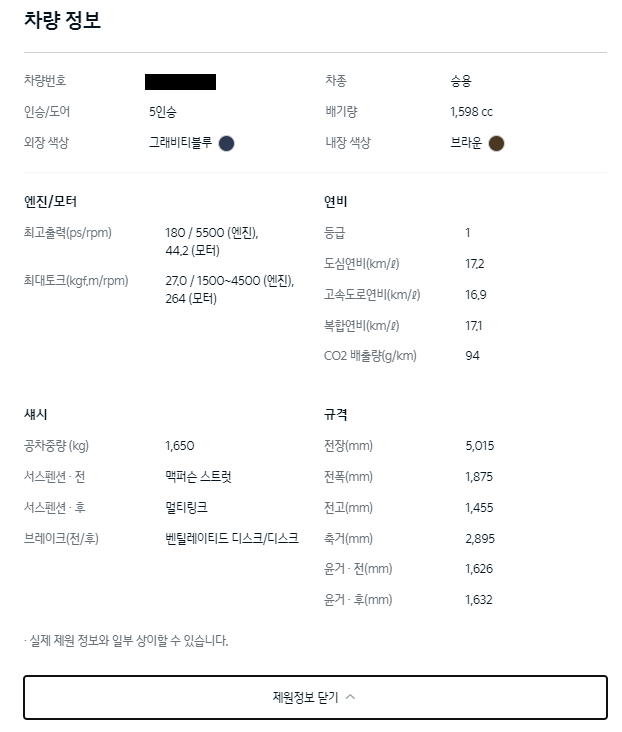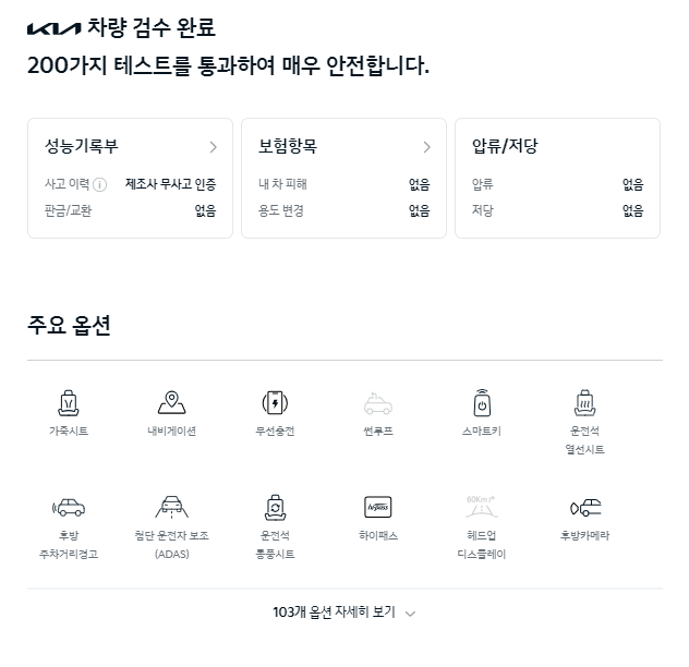 성능기록부와 보험항목, 압류/저당 정보가 나타나고, 옵션의 상세한 내용을 볼 수 있습니다. 이 차량에는 103개의 옵션이 적용되어 있습니다. 인증중고차가 아니면 이처럼 상세히 옵션을 확인하기는 힘들지도 모르겠습니다.