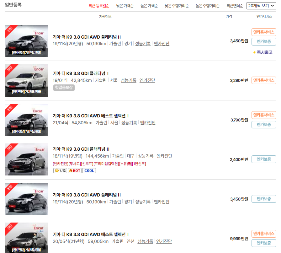 기아자동차가 직접 운영하는 중고차 거래 서비스인 기아인증중고차에 대한 관심이 높아지고 있는 가운데 대기업에서 판매하는 중고차의 가격과 서비스에 대한 궁금증도 높아지고 있습니다. 더 K9은 기아자동차 K시리즈의 플래그십으로서 제네시스 G80과 G90 사이에 위치하고 있는 차종입니다. 여기에서는 더 K9을 기아인증중고차에서 제공하고 있는 정보와 함께 기존의 대표적인 중고차 거래 서비스인 엔카와 기본적인 가격비교를 해보았습니다.