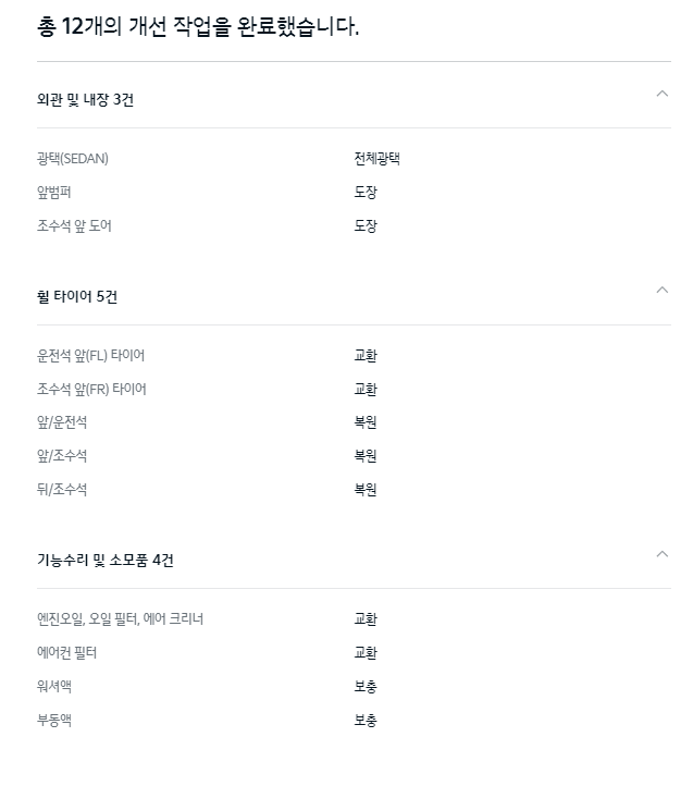 기아인증중고차에서 차량을 구입 후 개선 작업을 한 내용입니다. 다른 중고차 거래사이트에서 보여주기 힘든 정보로 어떤 부분에 대한 작업이 이루어졌는지 리스트로 제공하고 있습니다.