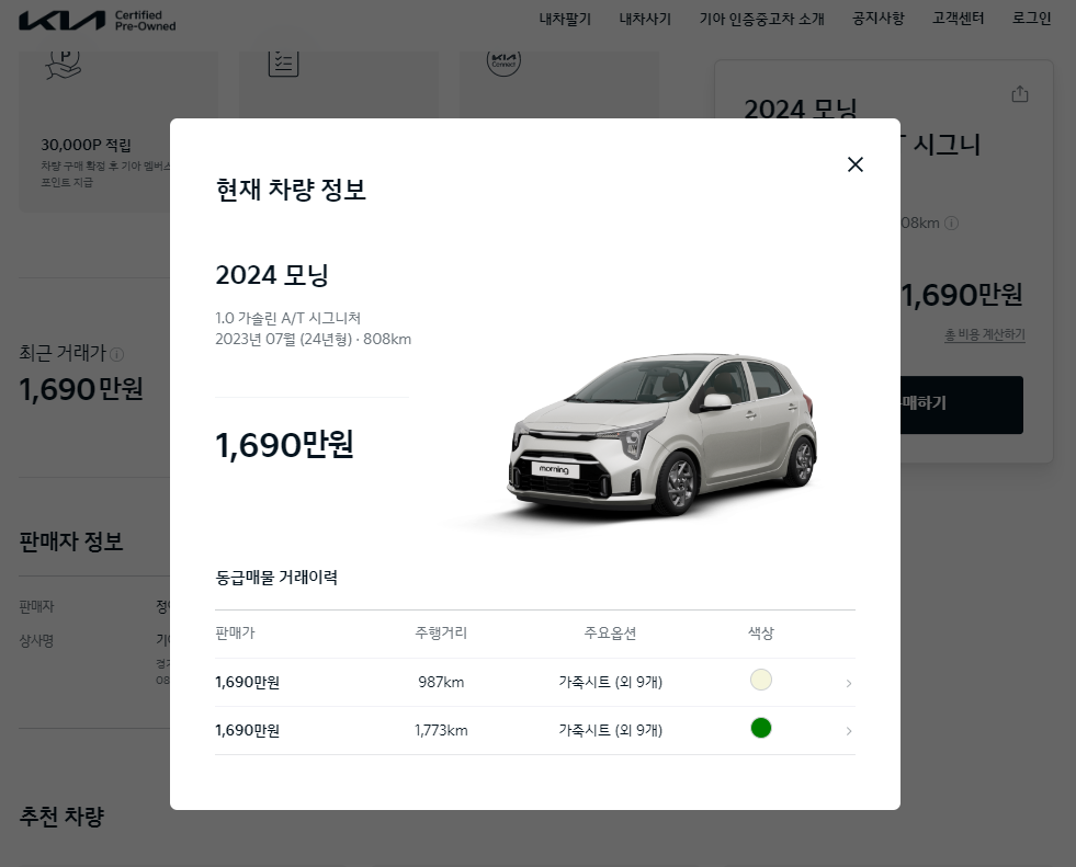 기아인증중고차의 홈페이지를 검색하여 들어가면 상단에 내차사기를 클릭하고 좌측의 차량리스트에서 승용 > 모닝 > 2024 모닝을 선택한 화면입니다. 모닝은 현시점(23.12.24)에 41대가 검색되고 있습니다. 주행거리가 가장 짧은 차량이 662km이고 가장 긴 차량은 4,367km입니다. 그야말로 새 차입니다.