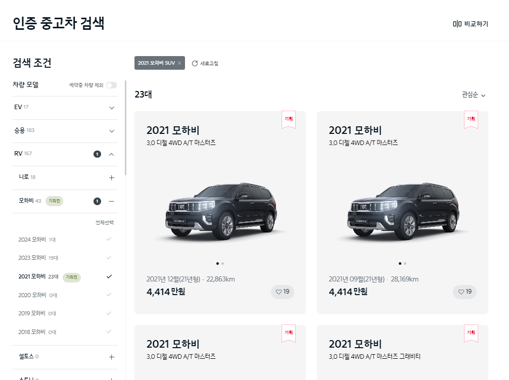 기아인증중고차의 홈페이지를 검색하여 들어가면 상단에 내차사기를 클릭하고 좌측의 차량리스트에서 RV > 모하비 > 2021 모하비를 선택한 화면입니다. 모하비는 현시점(23.12.24)에 43대가 검색되고 있습니다. 이 중에서 2021 모하비를 선택하면 23대가 검색됩니다. 주행거리가 가장 짧은 차량이 13,343km이고 가장 긴 차량은 52,051km입니다.