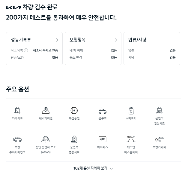 성능기록부와 보험항목, 압류/저당 정보가 나타나고, 옵션의 상세한 내용을 볼 수 있습니다. 이 차량에는 102개의 옵션이 적용되어 있습니다. 인증중고차가 아니면 이처럼 상세히 옵션을 확인하기는 힘들지도 모르겠습니다.