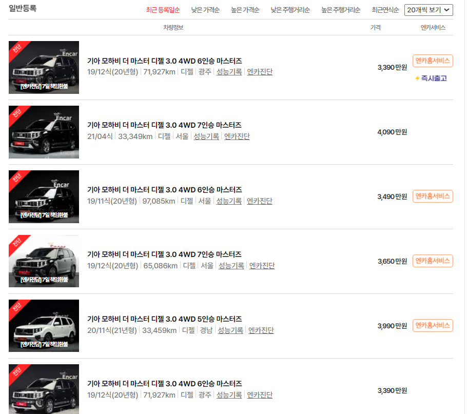 '2021 모하비 더 마스터'가 기아인증중고차에서 23대가 등록되어 있고, 엔카에는 200대나 등록되어 있습니다. 기아인증중고차 관심순 상위 10대의 평균가격은 4,370만원이고 엔카에서는 최근 등록일순으로 10대의 평균가격은 4,190만원으로 기아인증중고차가 180만원 정도 높습니다.