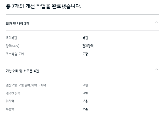 기아인증중고차에서 차량을 구입 후 개선 작업을 한 내용입니다. 다른 중고차 거래사이트에서 보여주기 힘든 정보로 어떤 부분에 대한 작업이 이루어졌는지 리스트로 제공하고 있습니다.