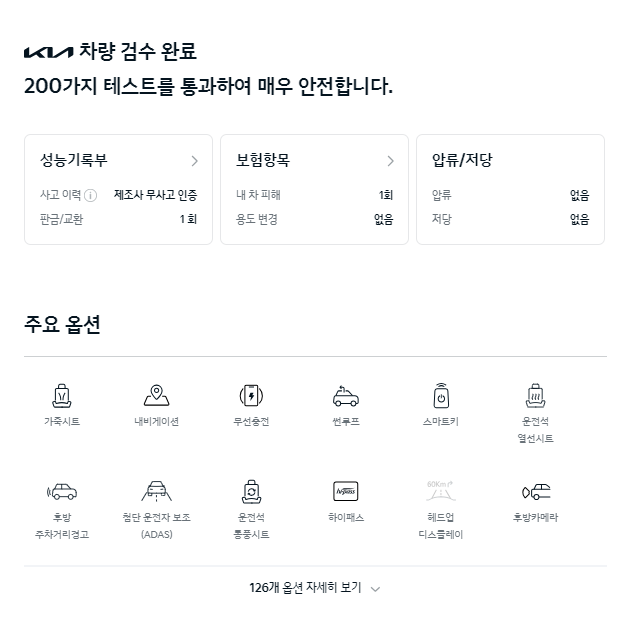 성능기록부와 보험항목, 압류/저당 정보가 나타나고, 옵션의 상세한 내용을 볼 수 있습니다. 이 차량에는 126개의 옵션이 적용되어 있습니다. 인증중고차가 아니면 이처럼 상세히 옵션을 확인하기는 힘들지도 모르겠습니다.