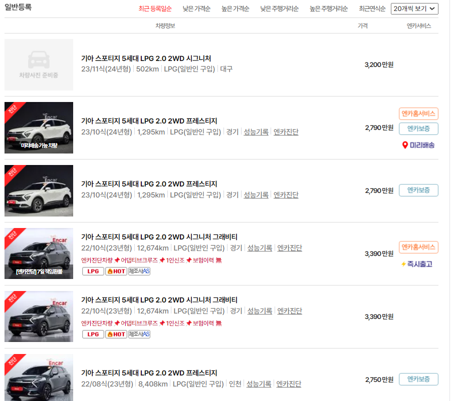 '2023 디 올 뉴 스포티지'가 기아인증중고차에서 9대가 등록되어 있고, 엔카에는 39대 등록되어 있습니다. 기아인증중고차 관심순 상위 9대의 평균가격은 3,633만원이고 엔카에서는 최근 등록일순으로 10대의 평균가격은 3,359만원으로 기아인증중고차가 270만원 정도 높습니다.