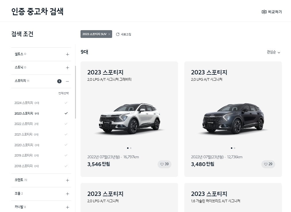기아인증중고차의 홈페이지를 검색하여 들어가면 상단에 내차사기를 클릭하고 좌측의 차량리스트에서 RV > 스포티지 > 2023 스포티지를 선택한 화면입니다. 스포티지는 현시점(23.12.24)에 11대가 검색되고 있습니다. 이중에서 2023 스포티지를 선택하면 9대로 줄어듭니다. 주행거리가 가장 짧은 차량이 6,380km이고 가장 긴 차량은 16,797km입니다.