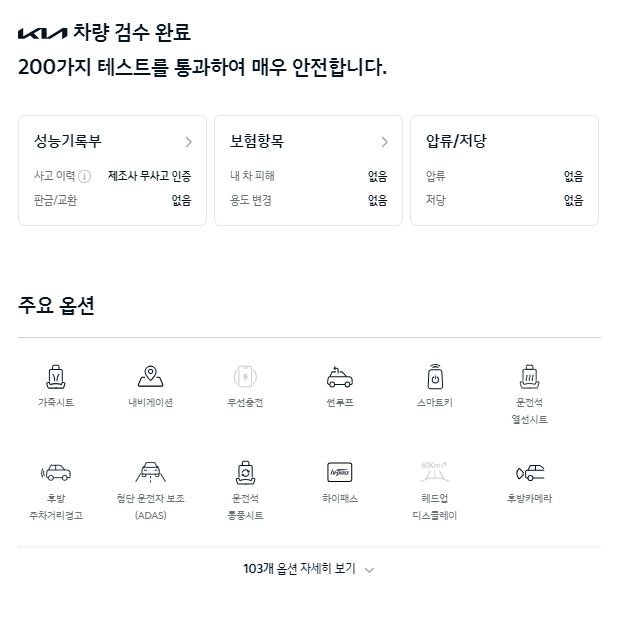 성능기록부와 보험항목, 압류/저당 정보가 나타나고, 옵션의 상세한 내용을 볼 수 있습니다. 이 차량에는 103개의 옵션이 적용되어 있습니다. 인증중고차가 아니면 이처럼 상세히 옵션을 확인하기는 힘들지도 모르겠습니다.