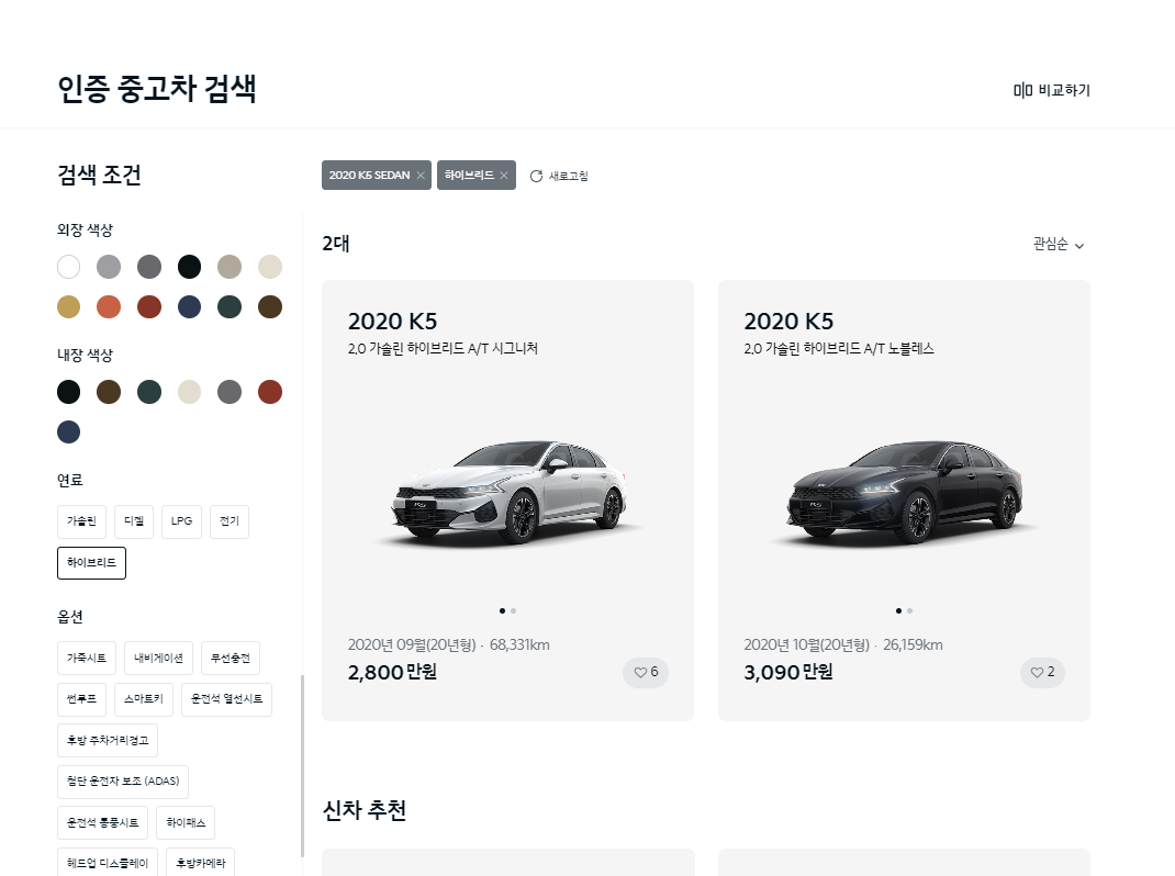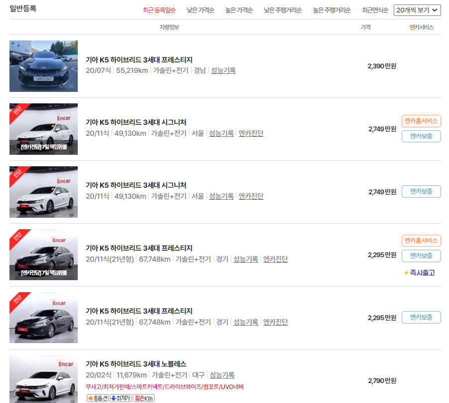 2020 K5 하이브리드가 기아인증중고차에서 2대가 등록되어 있고, 엔카에는 154대나 등록되어 있습니다. 기아인증중고차 2대의 평균가격은 2,945만원이고 엔카에서는 최근 등록일순으로 10대의 평균가격은 2,471만원으로 기아인증중고차가 470만원 정도 높습니다. 물론 이런 방식의 가격비교가 정확한 비교라고 볼 순 없습니다. 기아인증중고차는 신차에 가까운 차량만을 매입하여 판매하기 때문에 그렇습니다. 참고만 하면 될 것 같습니다.
