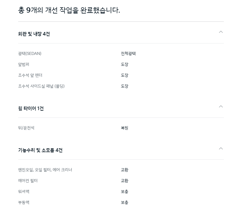 기아인증중고차에서 차량을 구입 후 개선 작업을 한 내용입니다. 다른 중고차 거래사이트에서 보여주기 힘든 정보로 어떤 부분에 대한 작업이 이루어졌는지 리스트로 제공하고 있습니다.