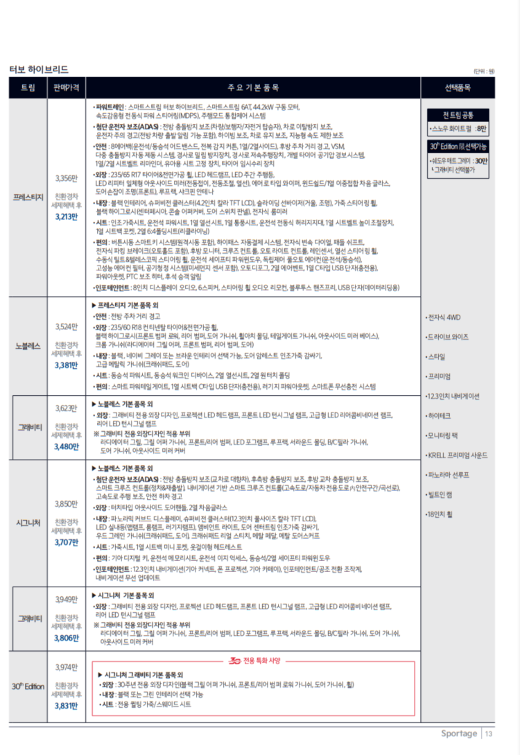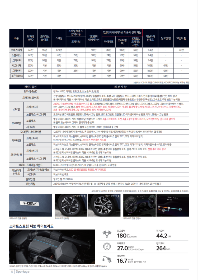 - 2WD에게 친환경차 세제혜택이 적용되는 쏘렌토,산타페와는 달리 디 올 뉴 스포티지 하이브리드 4WD는 연비가 15.2km/L로 친환경차 세제혜택이 적용됩니다.