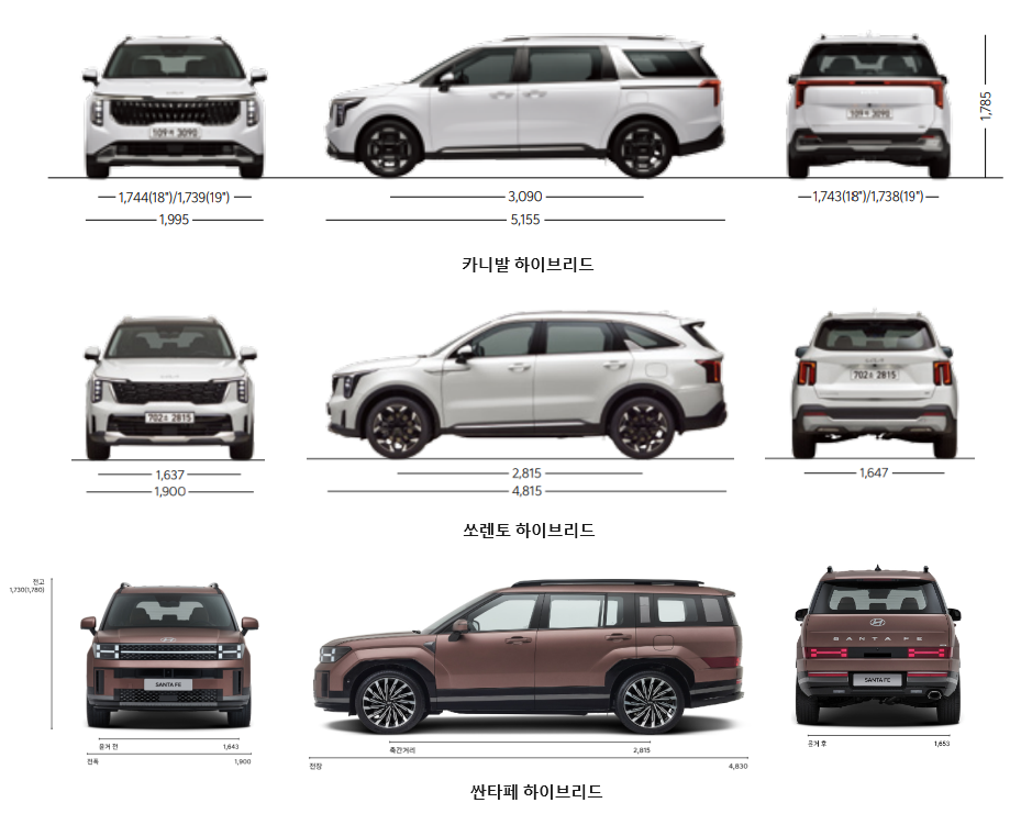 국산 승용 자동차 판매량에서 상위에 링크된 차량 중에서 하이브리드 차량을 찾는 것은 어려운 일이 아닙니다. 쏘렌토 하이브리드의 전체 판매량 1위는 벌써 수개월이나 지속되고 있고 쏘렌토 하이브리드 이전 1위를 차지했던 차량도 싼타페 하이브리드였습니다. 이 글에서는 우리나라에서 가장 많이 팔리는 하이브리드 3종이자 패밀리카로서도 가장 인기 있는 쏘렌토 하이브리드, 싼타페 하이브리드, 카니발 하이브리드를 서로 비교해 보고 알아봅니다.