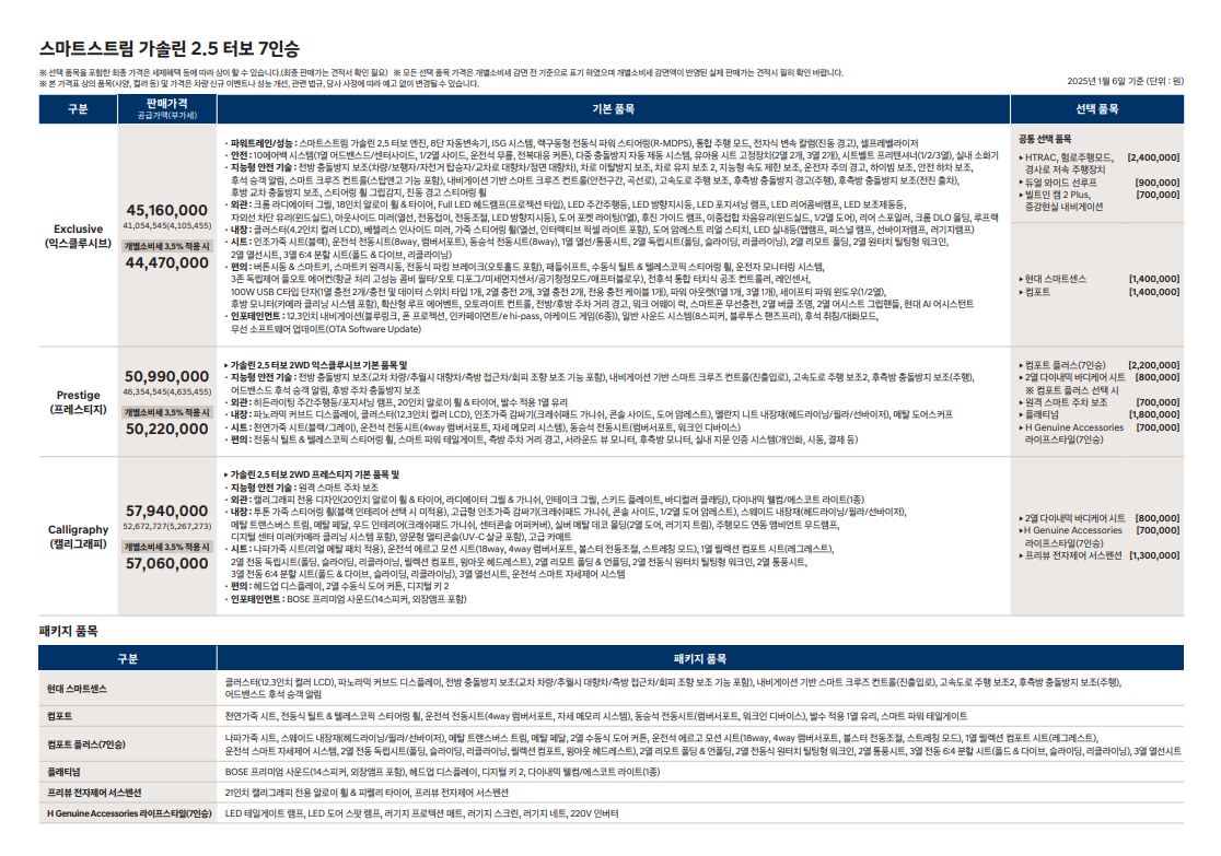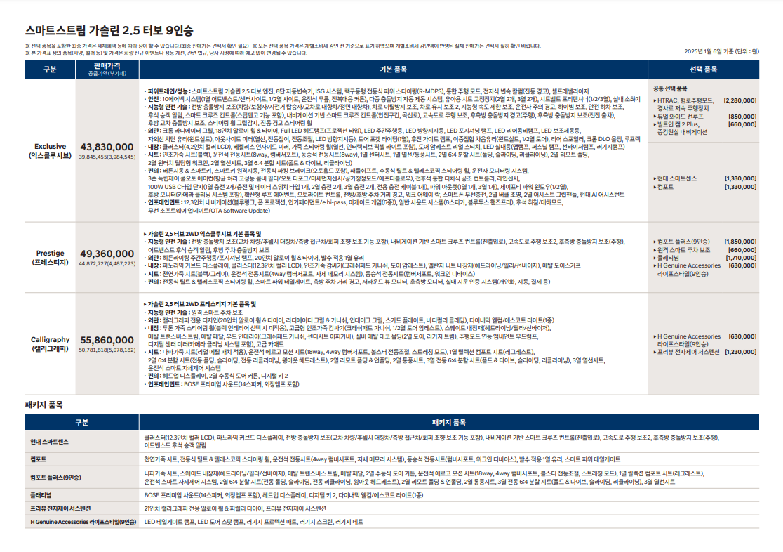 목차기본 옵션 및 가격인포테인먼트와 옵션옵션 추천 및 가격기본 옵션 및 가격트렌디 등급 2,460만 원, 프레스티지 등급 2,620만 원, 시그니처 2,750만 원, 시그니처 그래비티 2,900만 원의 가격으로