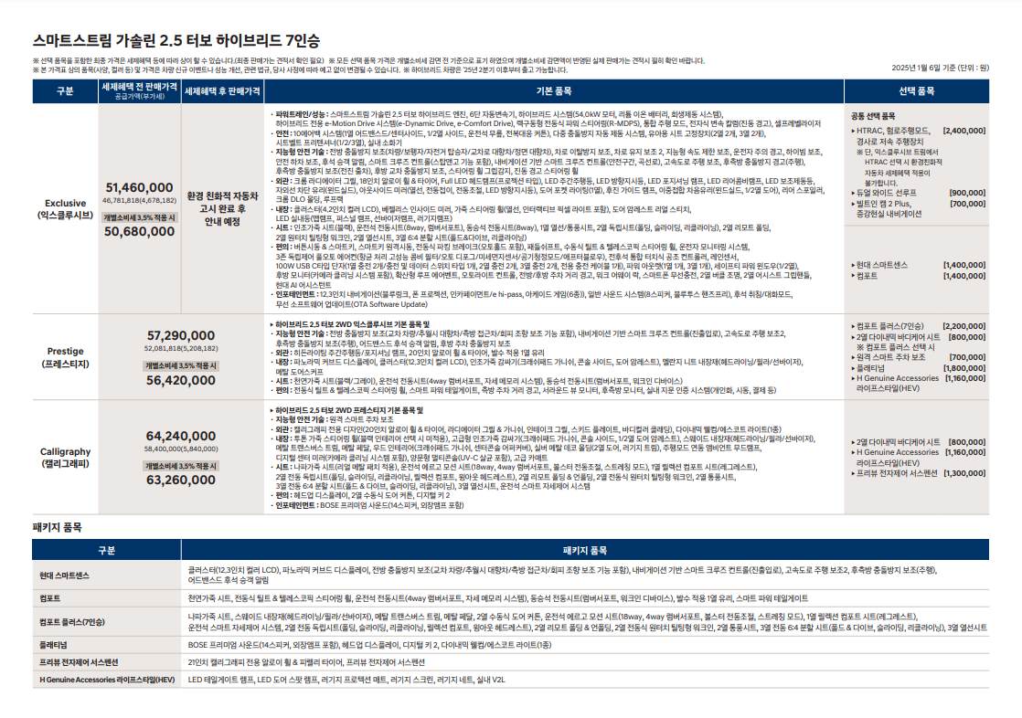 하이브리드의 경우, 익스클루시브 4,982~5,146만 원, 프레스티지 5,536~5,729만 원, 캘리그래피 6,186~6,424만 원으로 출시됩니다.