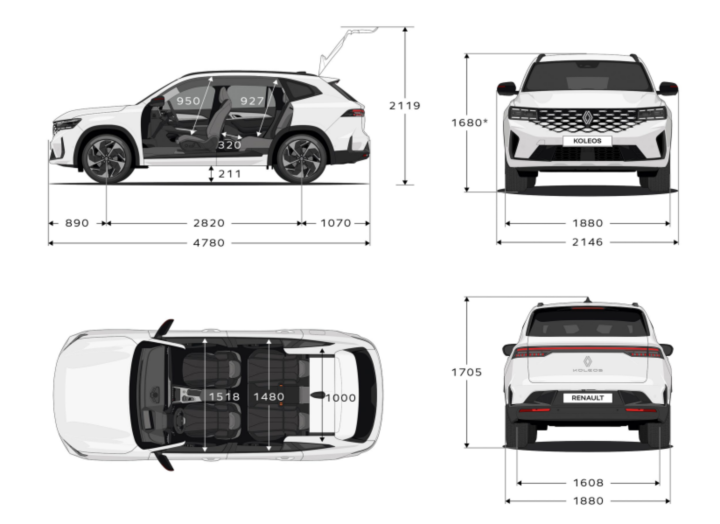 그랑 콜레오스의 측면은 더욱 세련된 라인과 함께 볼륨감 있는 차체를 자랑합니다. 19인치 알로이 휠은 차량의 고급스러움과 강력한 성능을 상징하며, 측면 라인에서 유려하게 이어지는 곡선은 SUV로서의 민첩함을 나타냅니다. 차체 크기는 전장 4,670mm, 전폭 1,860mm, 전고 1,680mm로 여유로운 크기를 자랑합니다. 이러한 디자인은 차량의 안정성을 높이며, 주행 중에도 우수한 공기 흐름을 제공합니다.