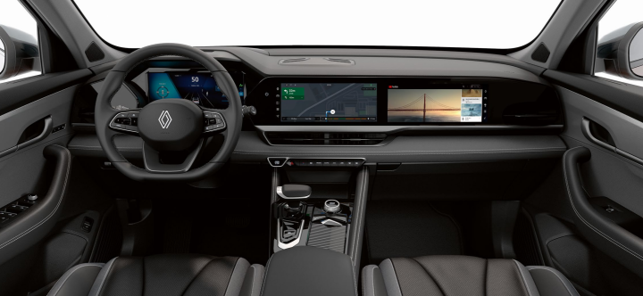 대시보드에는 12.3인치 풀 디지털 클러스터와 9.3인치 세로형 터치스크린이 장착되어 있습니다. 이 터치스크린은 르노의 최신 인포테인먼트 시스템인 'R-Link 2'와 연동되어 내비게이션, 블루투스, 스마트폰 연동, 음성 인식 등 다양한 기능을 지원합니다. 또한, Apple CarPlay와 Android Auto 기능도 탑재되어 있어 스마트폰과의 연결이 더욱 원활합니다.