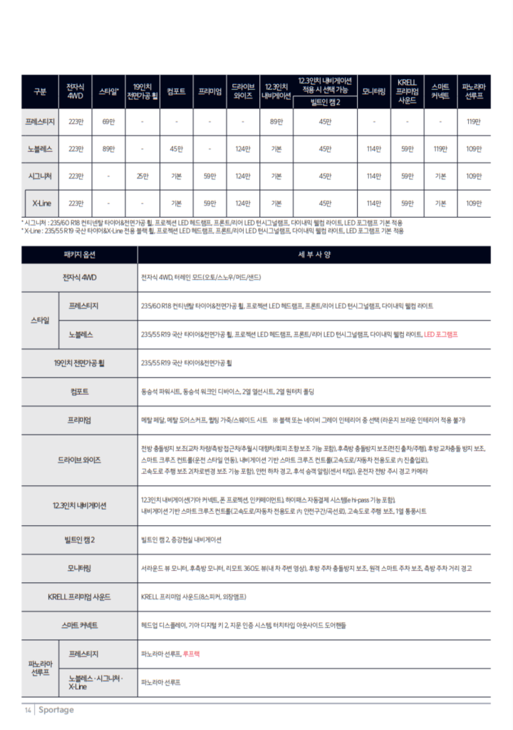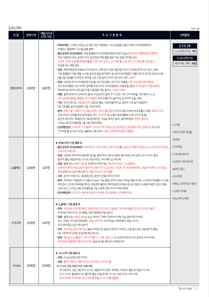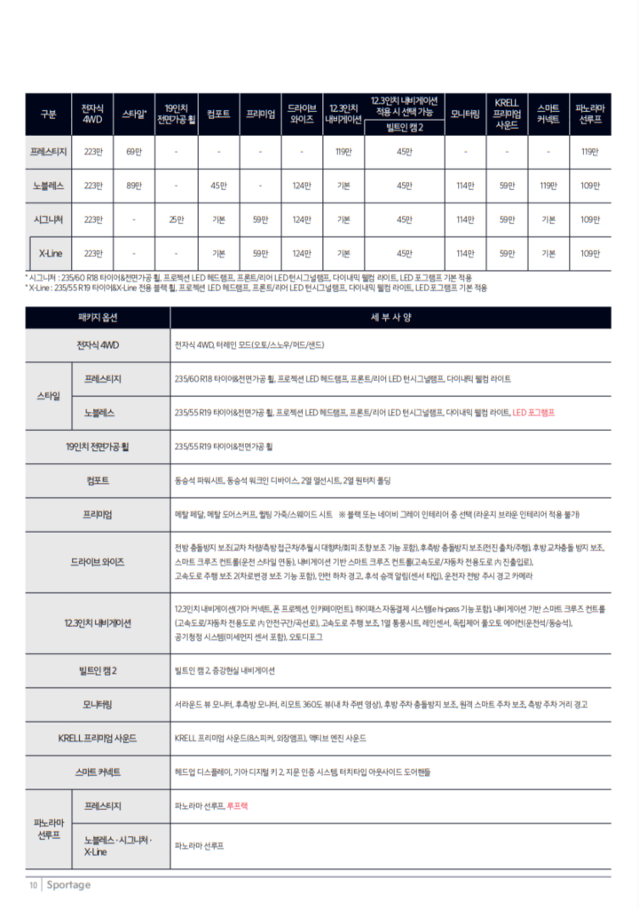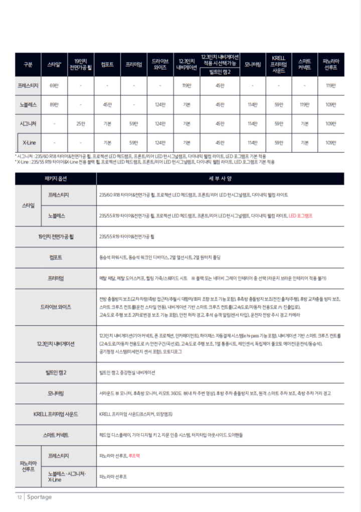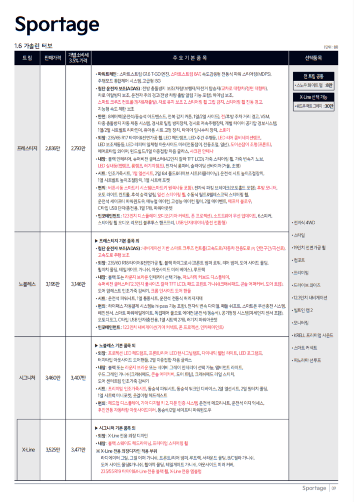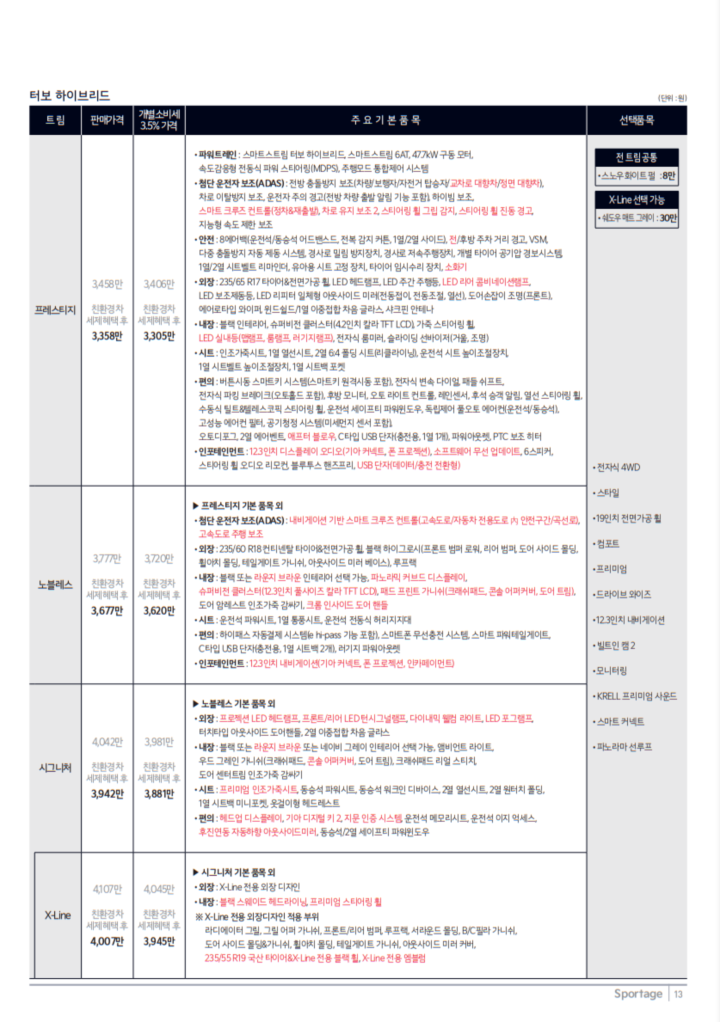 2025년형 스포티지 하이브리드는 다양한 트림 옵션을 제공합니다. 기본적으로 프레스티지, 노블레스, 시그니처, 시그니처 X-Line 등의 트림이 있으며, 각각의 가격과 사양에 따라 선택할 수 있습니다.