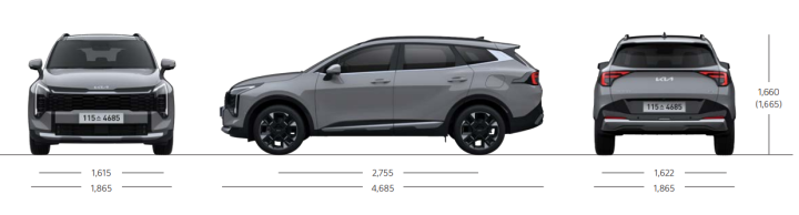 2025년형 스포티지 하이브리드의 외형 치수는 전장 4,685mm, 전폭 1,865mm, 전고 1,660~1,680mm로, 준중형 SUV 세그먼트에서 적당한 크기를 자랑합니다. 이러한 치수는 도심 주행과 주차에 용이하면서도 충분한 실내 공간을 확보할 수 있는 균형 잡힌 크기입니다.
