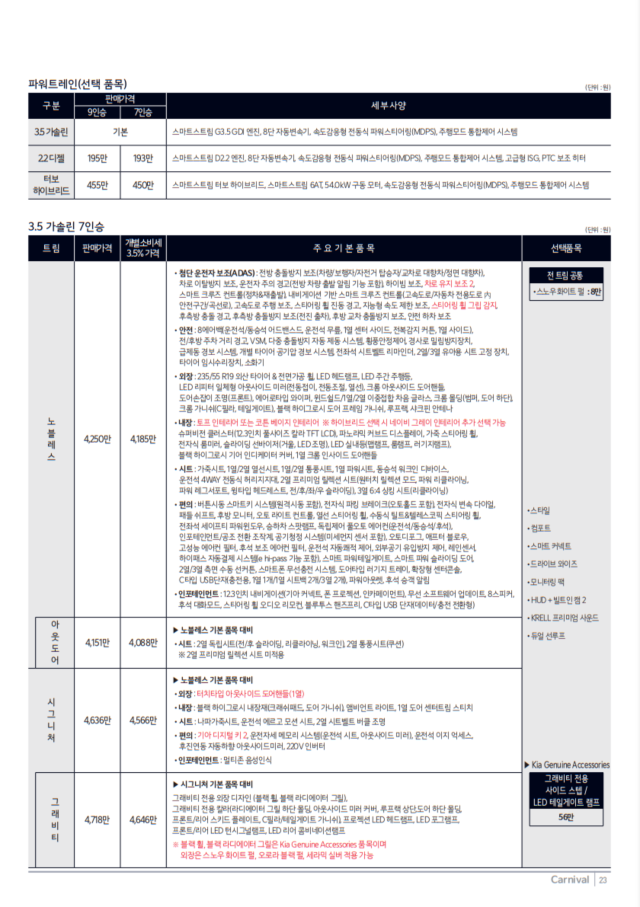2025년형 카니발 하이브리드는 다양한 트림 옵션을 제공합니다. 기본적으로 노블레스, 시그니처, 시그니처 그래비티 등의 트림이 있으며, 각각의 가격과 사양에 따라 선택할 수 있습니다.