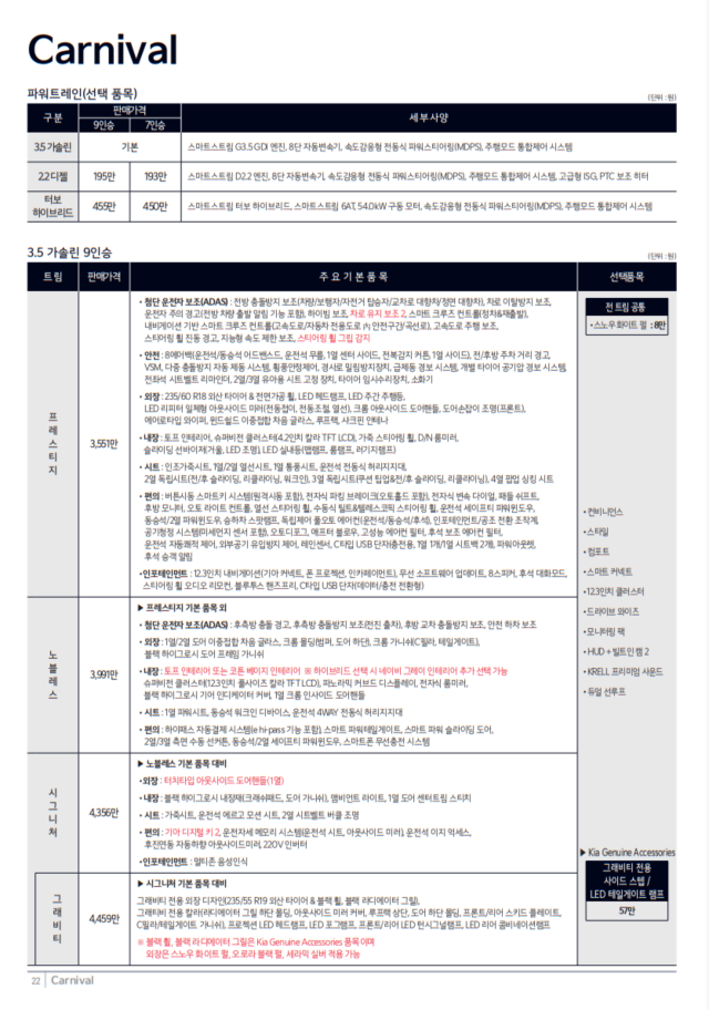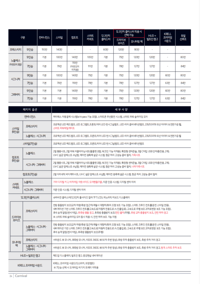 시그니처 트림에서는 터치타입 아웃사이드 도어핸들(1열), 앰비언트 라이트, 가죽시트, 운전석 에르고 모션 시트 등이 추가됩니다. 또한 기아 디지털 키 2, 운전자세 메모리 시스템, 220V 인버터 등 편의 사양이 강화됩니다.