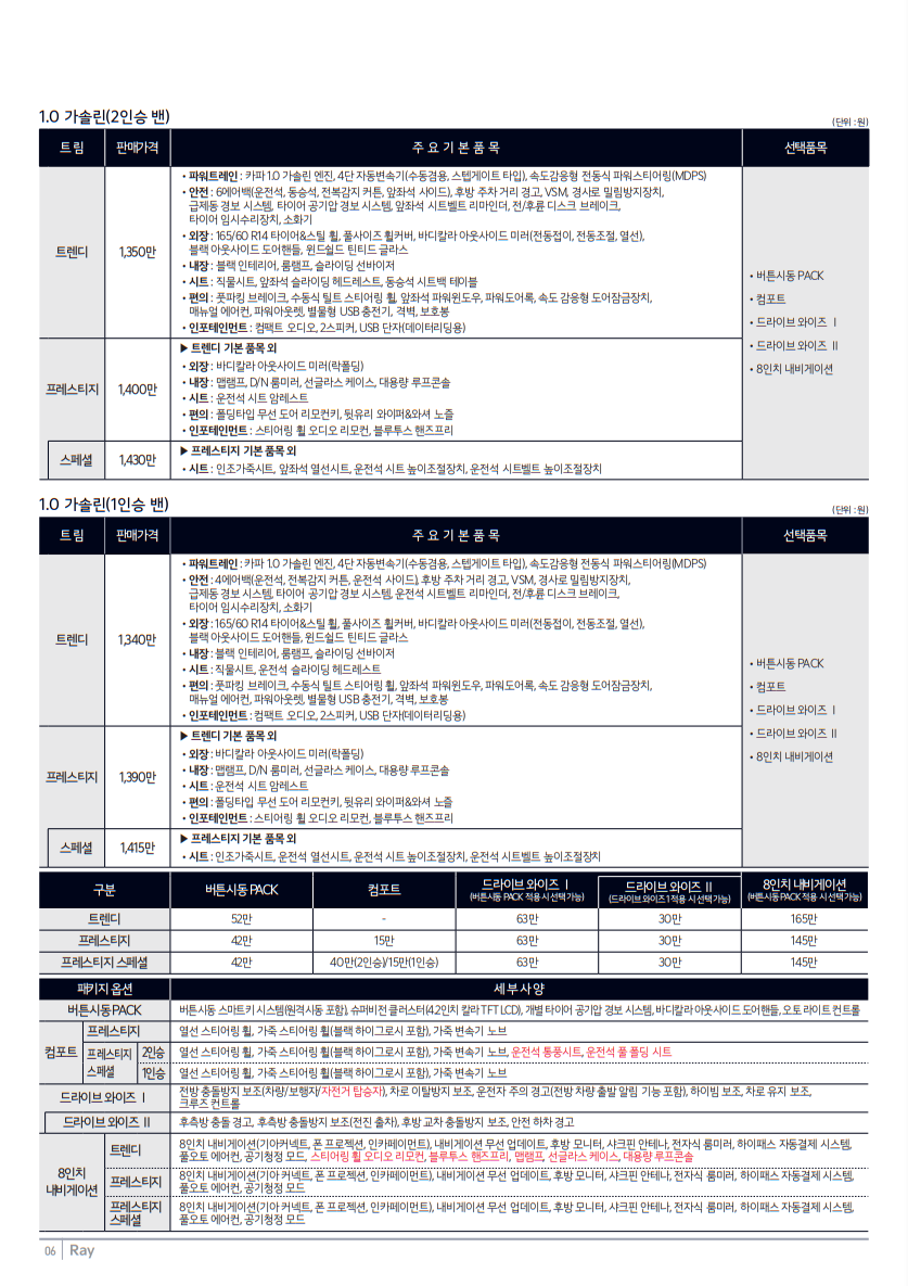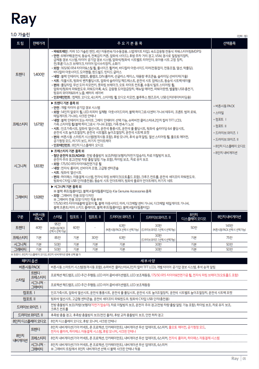- 프레스티지: 14인치 알로이휠, 버튼시동, 8인치 디스플레이 오디오 기본 제공