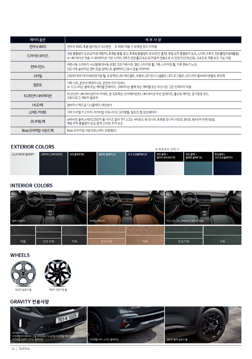 2025 셀토스는 소형 SUV임에도 불구하고 안정적인 주행 성능과 편안한 승차감을 제공합니다. 2.0 가솔린 엔진은 149마력의 출력으로 도심 주행에 충분한 힘을 발휘하며, 고속도로에서도 안정적인 주행이 가능합니다.서스펜션 튜닝으로 인한 부드러운 승차감은 장거리 주행 시에도 피로도를 줄여줍니다. 또한, 전·후방 주차 거리 경고 시스템이 기본 탑재되어 좁은 공간에서의 주차도 용이합니다.1.6 가솔린 터보 엔진 옵션을 선택하면 더욱 강력한 가속 성능을 경험할 수 있어, 역동적인 주행을 즐기는 운전자들에게 적합합니다.