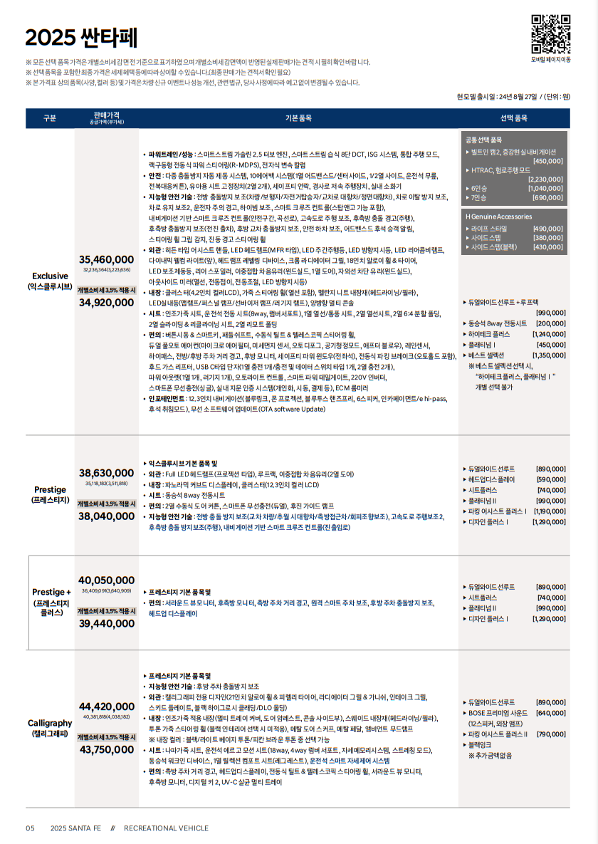 세련된 디자인, 다양한 파워트레인 옵션, 첨단 안전 및 편의 기능의 조화를 통해 현대적인 가족의 니즈에 완벽히 부합하는 차량으로 자리매김하고 있습니다.특히 프레스티지 트림부터 기본 적용되는 고급 안전 사양들은 가족을 위한 SUV로서의 가치를 한층 높여줍니다. 또한, 하이브리드 모델의 경우 14.4km/L의 우수한 연비로 경제성까지 갖추어 실용적인 선택이 될 것입니다.다양한 트림과 옵션 선택이 가능해 개인의 취향과 필요에 맞는 차량 구성이 가능한 점도 2025 싼타페의 큰 장점입니다.
