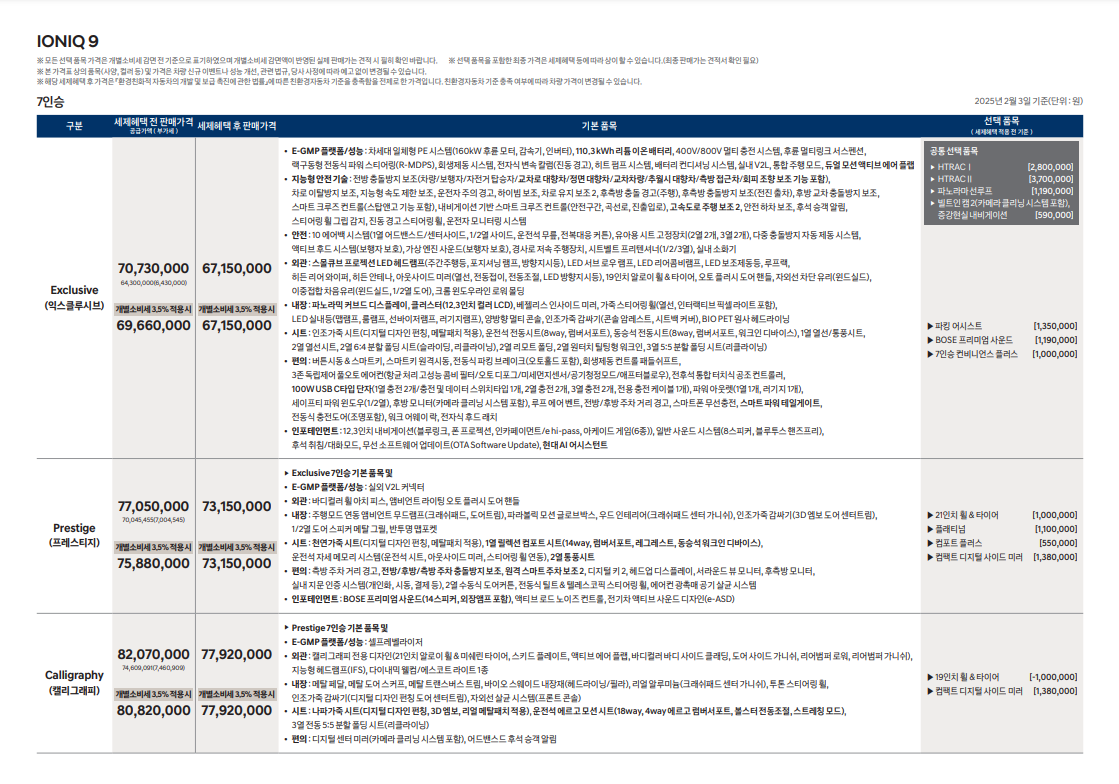 아이오닉 9의 구체적인 트림별 가격 정보는 제공된 검색 결과에 포함되어 있지 않습니다. 그러나 캘리그래피 트림이 언급되어 있어, 이 모델이 고급 트림으로 제공될 것으로 예상됩니다.