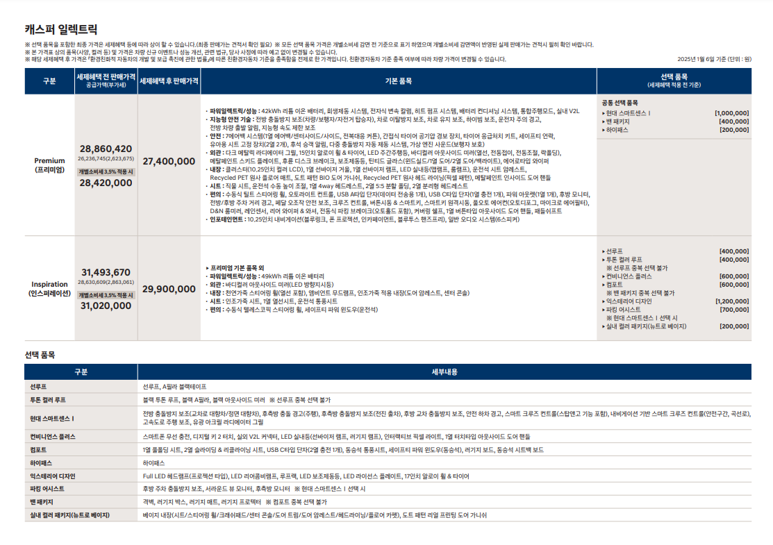 캐스퍼 일렉트릭은 인스퍼레이션 트림 한 가지로 출시되었습니다. 가격은 다음과 같습니다: