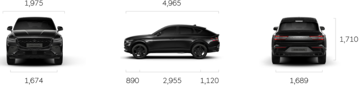 GV80 쿠페 블랙은 전장 4,965mm, 전폭 1,975mm, 전고 1,710mm의 차체 크기를 가지고 있으며, 휠베이스는 2,955mm입니다. 이러한 크기는 넓은 실내 공간을 제공하여, 앞좌석과 뒷좌석 모두에서 편안한 레그룸과 헤드룸을 보장합니다. 적재 공간 또한 충분하여 가족 여행이나 다양한 레저 활동에 적합한 수납 능력을 자랑합니다.