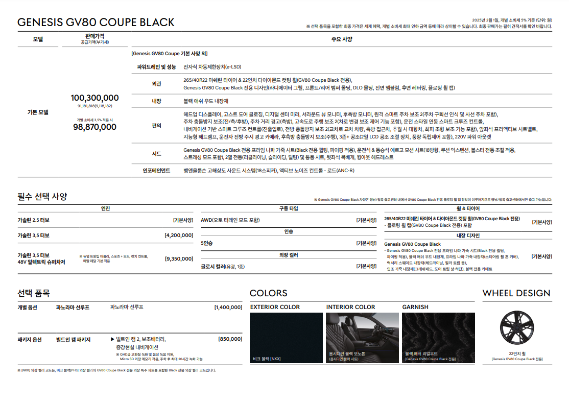 GV80 쿠페 블랙은 3.5T AWD 단일 사양으로 제공되며, 기본 가격은 9,860만 원입니다. 이 모델은 인승과 파노라마 선루프, 빌트인 캠 패키지를 제외한 모든 유상 옵션이 기본으로 탑재되어, 더욱 완성도 높은 고급스러움을 자랑합니다. 특히, 블랙 콘셉트를 바탕으로 내·외장의 섬세한 디테일까지 모두 블랙으로 마감하여 고급스러움을 극대화했습니다.