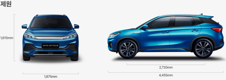 아토3는 길이 4,455mm, 너비 1,875mm, 높이 1,615mm, 휠베이스 2,720mm의 차체 크기를 자랑합니다. 이는 동급 경쟁 모델인 현대 코나 일렉트릭(4,355mm/1,825mm/1,575mm)과 기아 EV3(4,300mm/1,850mm/1,560mm)보다 전반적으로 큰 크기입니다.