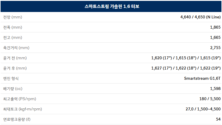 가솔린 모델은 1.6 터보 + 7단 DCT 조합이다. 가격은 2,848만원(모던)부터 시작해 N Line 기준 3,545만원까지 형성된다.